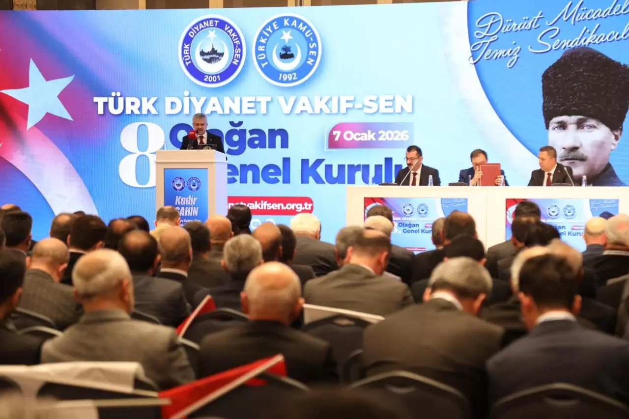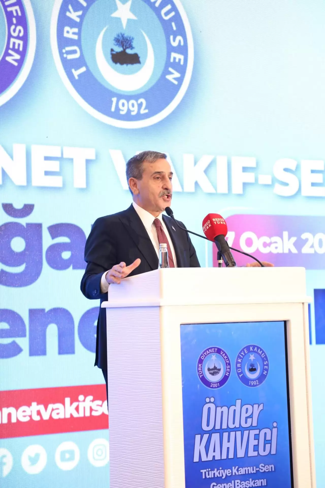 Türkiye Kamu-Sen Genel Başkanı Önder Kahveci, Türk Diyanet Vakıf-Sen Genel Kurulu’nda yaptığı kapsamlı konuşmada sendikal mücadelenin temelini, kamu çalışanlarının ekonomik taleplerini ve küresel gelişmelere ilişkin değerlendirmelerini paylaştı.