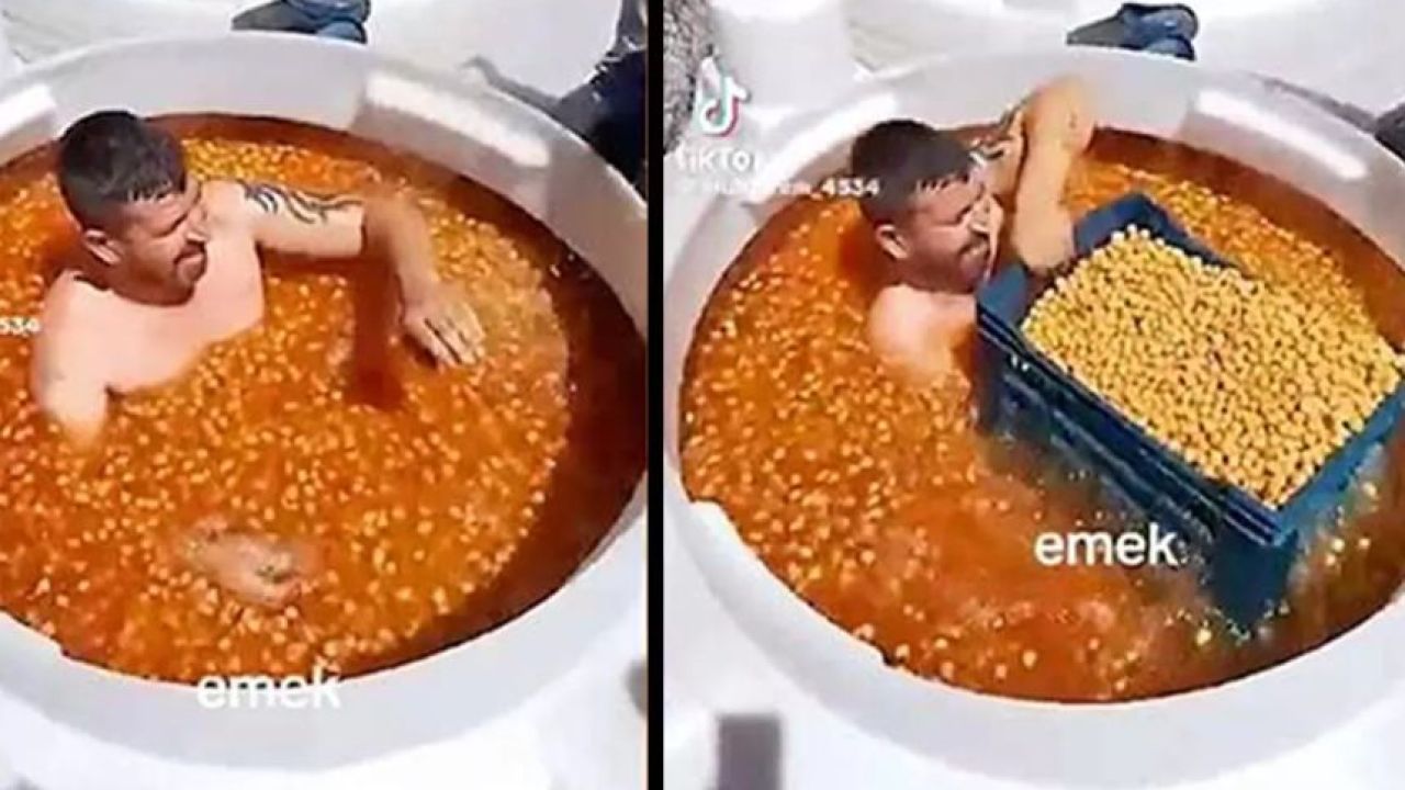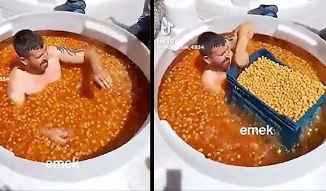 Bir çalışanın yeşil zeytin tankının içine çıplak bir şekilde girerek kendisine verilen boş sepetleri doldurduğu anlar sosyal medyadan paylaşıldı.