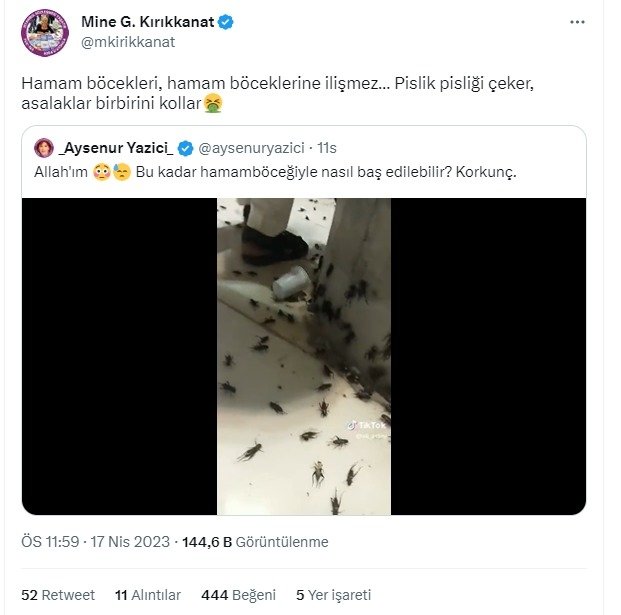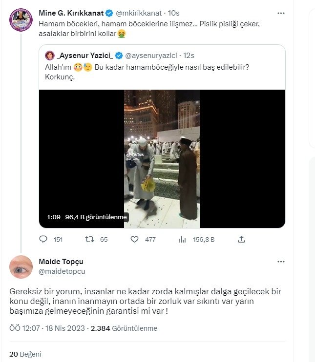 Spiker ve televizyon sunucusu olarak uzun yıllar çalışan Ayşenur Yazıcı ise Kâbe'deki çekirge istilasını hamam böceği istilası olarak algılayarak videoyu paylaşıp "Allah'ım! Bu kadar hamamböceğiyle nasıl baş edilebilir? Korkunç" yorumunda bulundu. Cumhuriyet Gazetesi'nde köşe yazarlığı yapan Mine Kırıkkanat ise Kâbe'deki çekirge ya da cırcır böceği istilasının görüntülerini paylaşıp hamam böcekleri olduğunu ifade ederek imalarda bulundu. Kırıkkanat, "Hamam böcekleri, hamam böceklerine ilişmez… Pislik pisliği çeker, asalaklar birbirini kollar!" ifadelerini kullanarak Müslümanlara hakaretler etti. Sosyal medyada Kırıkkanat'ın bu sözleri tepkiyle karşılandı.