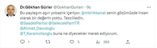 Dr. Gökhan Gürler ise Kırıkkanat'ın ifadeleri için "Bu paylaşım aşırı yobazlık içeriyor Mine Kırıkkanat. Senin gözümüzde insan olarak bir değerin yoktu. Tescilledin. Saadet, Gelecek, Ahmet Davutoğlu ve Temel Karamollaoğlu buna ne diyecekler merak ediyorum" yorumunda bulundu.