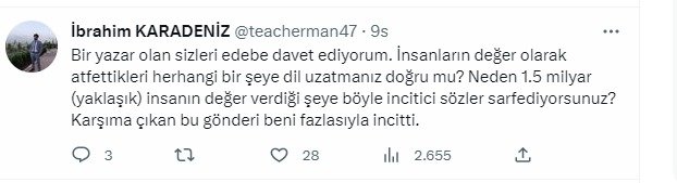 İbrahim Karadeniz ise Kırıkkanat'a hitaben "Bir yazar olan sizleri edebe davet ediyorum. İnsanların değer olarak atfettikleri herhangi bir şeye dil uzatmanız doğru mu? Neden 1.5 milyar (yaklaşık) insanın değer verdiği şeye böyle incitici sözler sarfediyorsunuz? Karşıma çıkan bu gönderi beni fazlasıyla incitti" dedi.