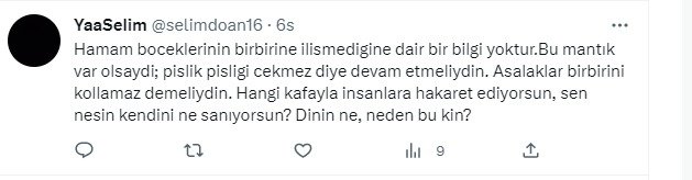 Selim isimli sosyal medya kullanıcısı ise Kırıkkanat'a tepkisini şöyle dile getirdi: "Hamam böceklerinin birbirine ilişmediğine dair bir bilgi yoktur. Bu mantık var olsaydı; pislik pisliği çekmez diye devam etmeliydin. Asalaklar birbirini kollamaz demeliydin. Hangi kafayla insanlara hakaret ediyorsun, sen nesin, kendini ne sanıyorsun? Dinin ne, neden bu kin?"