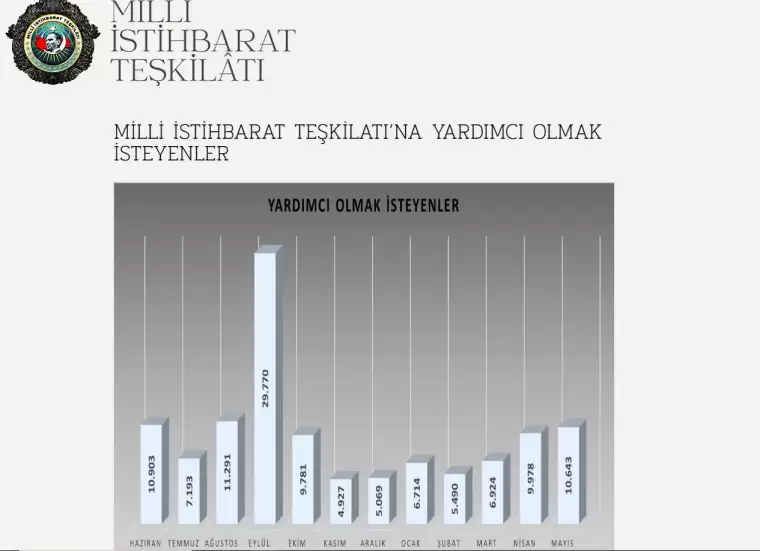 1 yıllık süreçte en yüksek başvuru 29 bin 770 ile 2023 Eylül ayında gerçekleşti. En düşük başvuru ise bu süreçte 4 bin 927 ile Kasım 2023'te oldu. 1 yıllık süreçte haziranda 10 bin 903, temmuzda 7 bin 193, ağustosta 11 bin 291, ekimde 9 bin 781, aralıkta 5 bin 069, ocakta 6 bin 714, şubatta 5 bin 490, martta 6 bin 924, nisanda 9 bin 978, mayısta da 10 bin 643 kişi MİT'e yardım teklifinde bulundu.