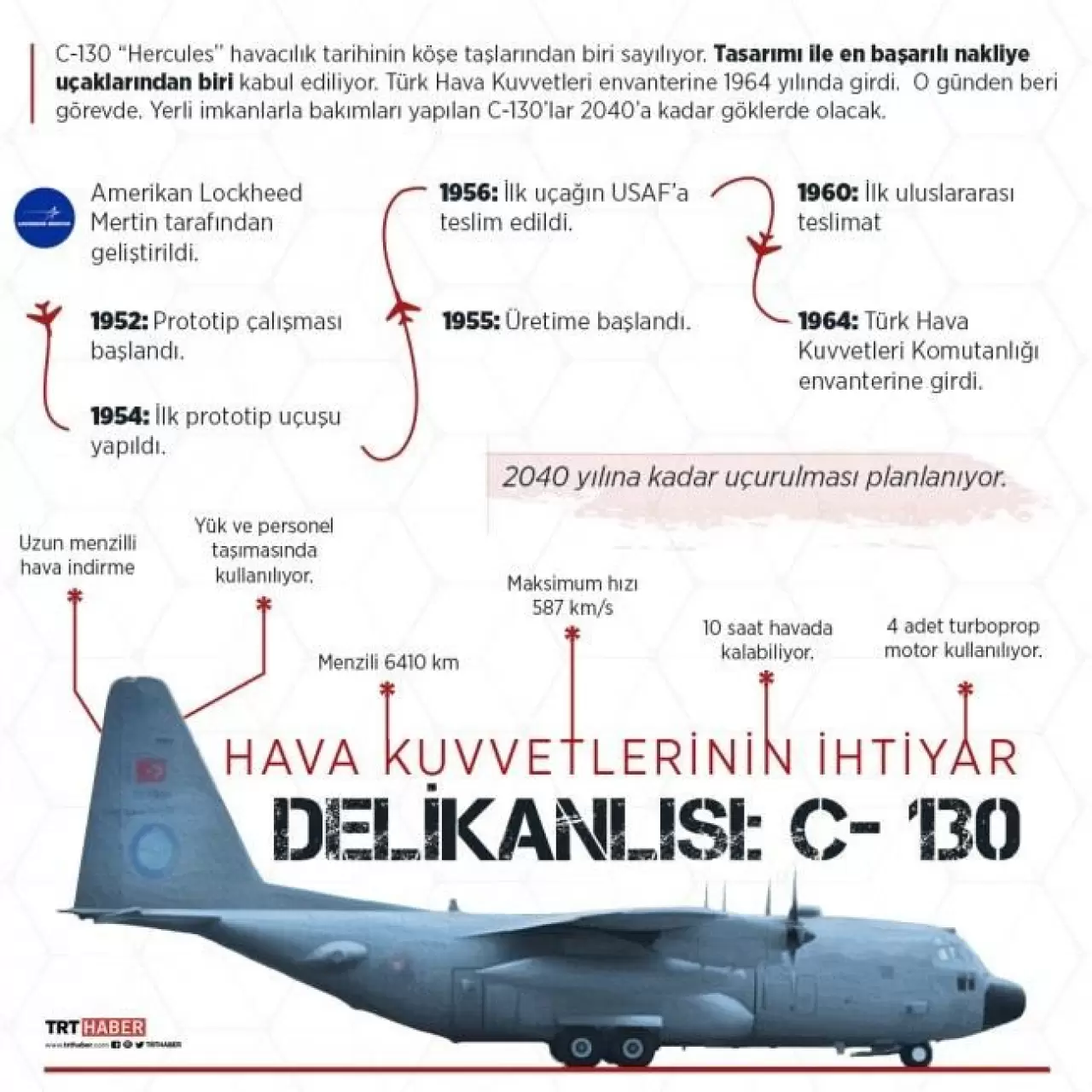 Menzili 6 bin 410 km olan ve 587 km/s’e hız yapma kapasitesine sahip olan Hercules, 10 saat havada kalabilme özelliğine sahip güçlü uçaklar arasında yer alıyor.