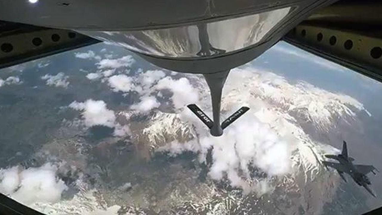 Bakanlığın Twitter hesabından yapılan paylaşımda, F16'lara kesintisiz uçuş amacıyla havada yapılan yakıt ikmalinin görüntüleri yer aldı.