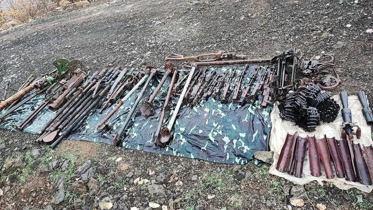 "11 AK-47 piyade tüfeği ve 1 adet şarjörü, Doçka makineli tüfeğe ait 1 çatal ayak, 2 hava sehpası, 14 tüfek namlusu, 2 tüfek gövdesi, 2 alev gizleyen, 241 Doçka makineli tüfek mühimmatı, 82 milimetre havan namlu döşeme, 3 el kundağı, 4 çatal ayak, 6 boş şerit, 11 RPG-7 üst kundağı."