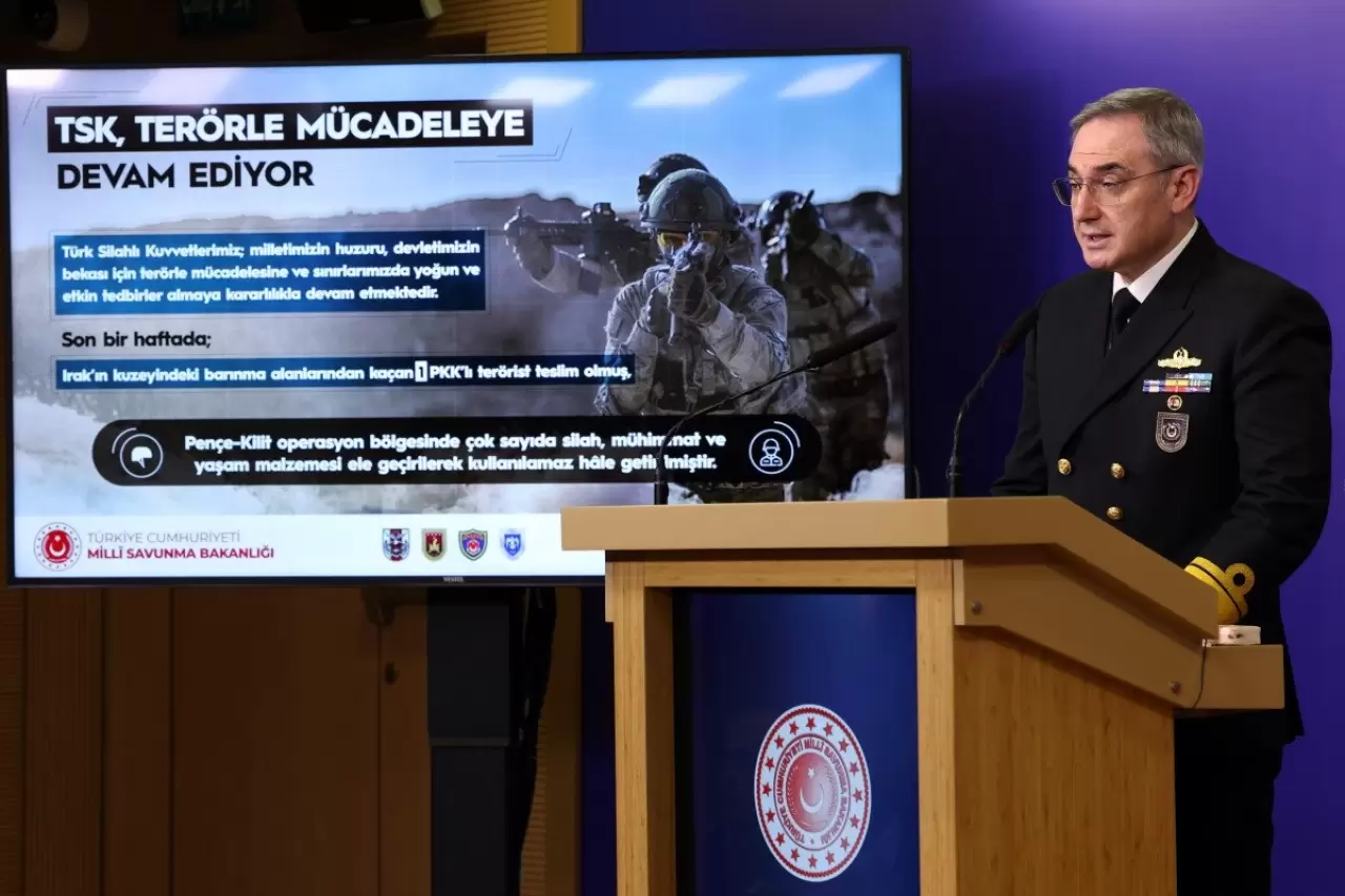 1 PKK'lı teröristin daha teslim olduğunu bildiren Tuğamiral Aktürk, "Pençe-Kilit operasyon bölgesinde tespit edilen teröristlere ait mağaralarda çok sayıda silah, mühimmat ve yaşam malzemesi ele geçirilerek kullanılamaz hale getirilmiştir" şeklinde konuştu.