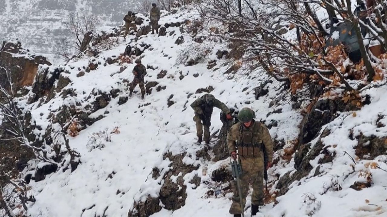 Görüntülerde, askerlerin zorlu arazi şartlarına ve soğuk havaya rağmen gerçekleştirdiği operasyonlar ve yürüttüğü faaliyetler yer alıyor.
