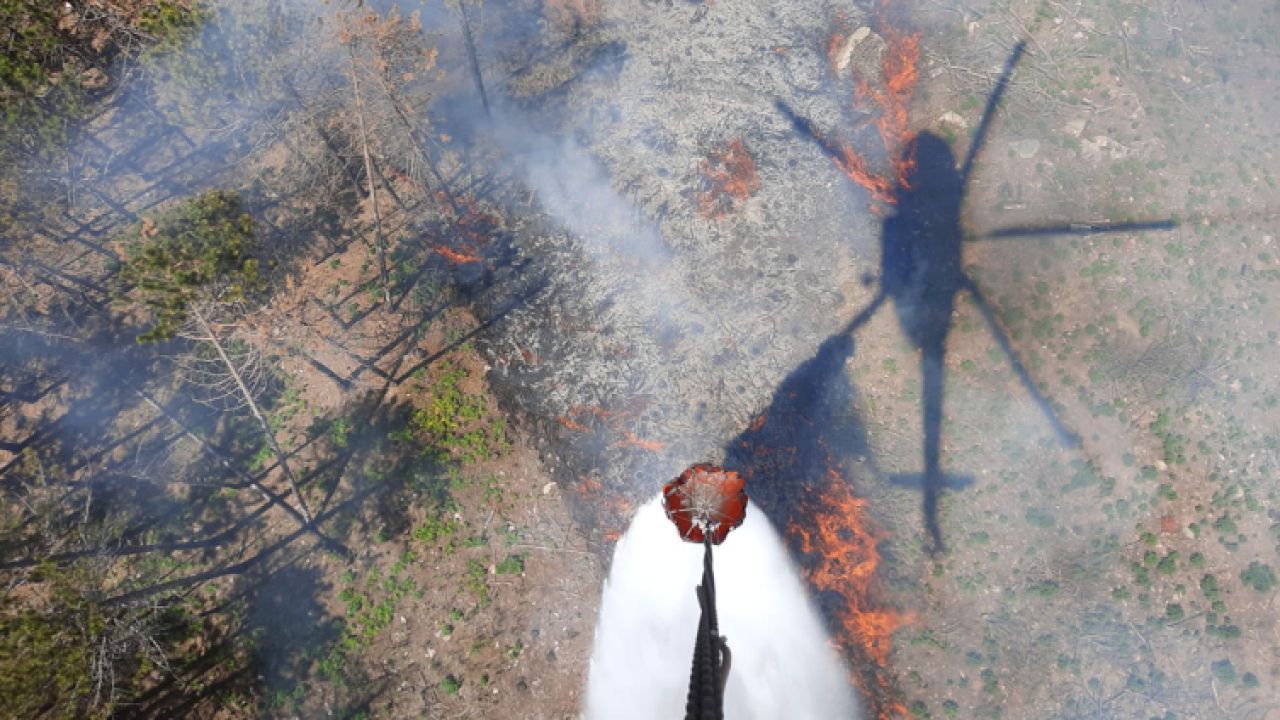 Yangın 7 helikopter, 6 uçak, 15 arazöz ve 5 su tankeri desteğindeki ekiplerce kontrol altına alınmaya çalışılıyor.