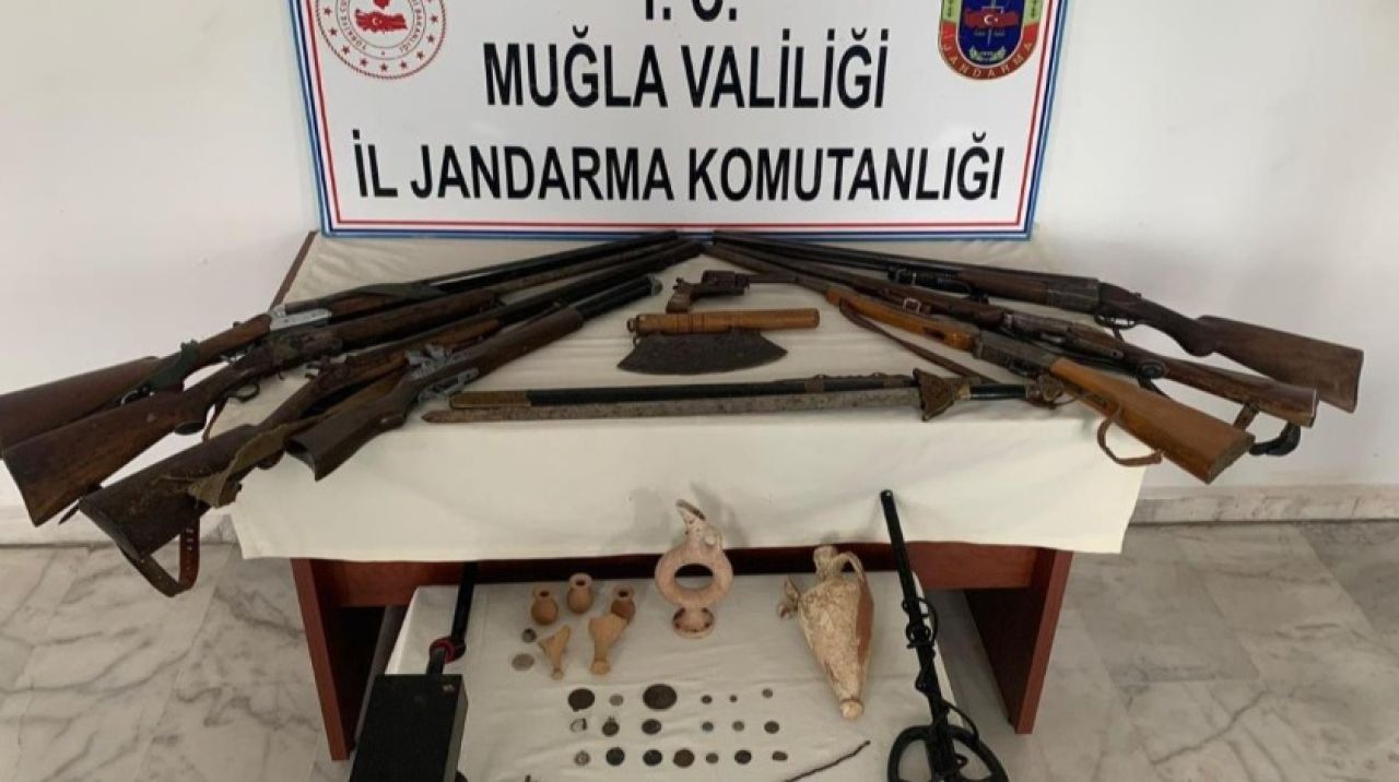 İl Jandarma Komutanlığı Kaçakçılık ve Organize Suçlarla Mücadele (KOM) ile İstihbarat Şube Müdürlüğü ekipleri, Yatağan'ın Bahçeyaka ve Gökpınar mahallelerinde yaşayan 2 kişide tarihi eser bulunduğu bilgisini aldı. Ekipler, dün sabah saatlerinde İ.Ş. ve H.B.'nin ev ve araçlarında yaptığı aramada Helenistik döneme ait 10 bronz sikke, Roma dönemine ait 1 gümüş yüzük, 1 gümüş kolye, 5 gözyaşı şişesi, 1 amfora, 3 metal obje, 1 gümüş obje, eski dönemlere ait 1 satır, Hitit dönemine ait 1 vazo, eski dönemlere ait olduğu değerlendirilen kılıç, 1 ruhsatsız tabanca, 7 ruhsatsız av tüfeği ve define aramada kullanılan dedektör ele geçirildi.