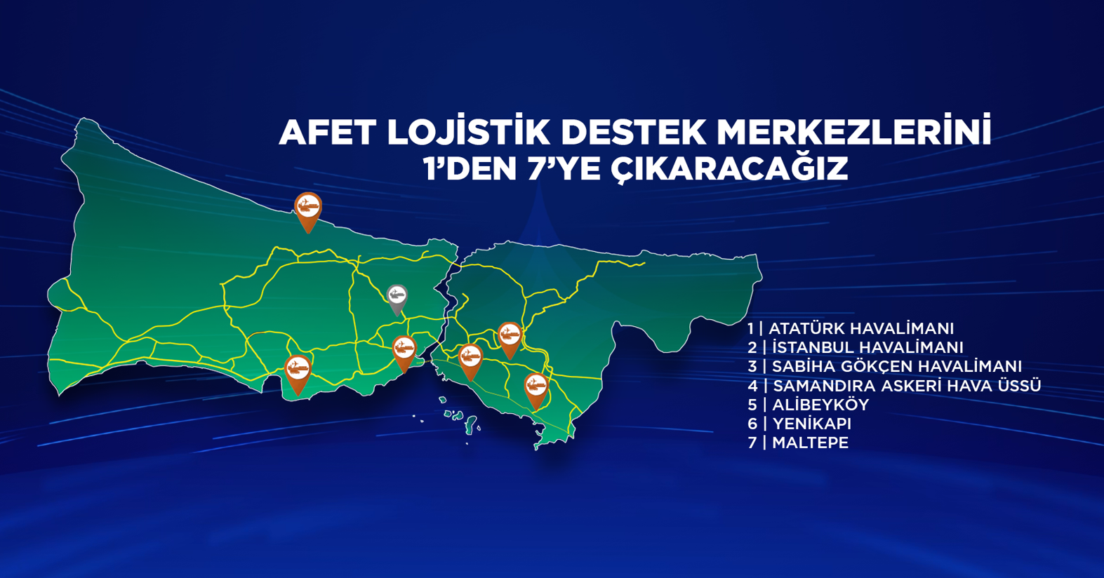 Afet lojistik merkezlerinin sayısı 1’den 7’ye çıkarılacak. Atatürk Havalimanı, İstanbul Havalimanı, Sabiha Gökçen Havalimanı, Samandıra Askeri Hava Üssü, Alibeyköy, Yenikapı ve Maltepe’de 6 yeni lojistik destek merkezi yapılacak.
