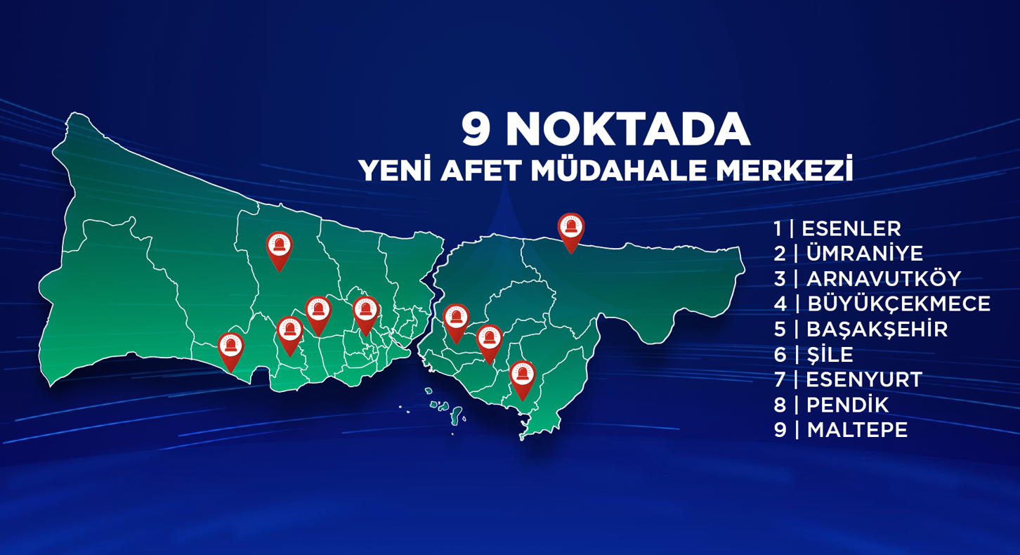 Afet durumları için 9 noktada itfaiye, tıbbi ünite ve iletişim altyapısına sahip 9 adet Afet Müdahale Merkezi kurulacak.