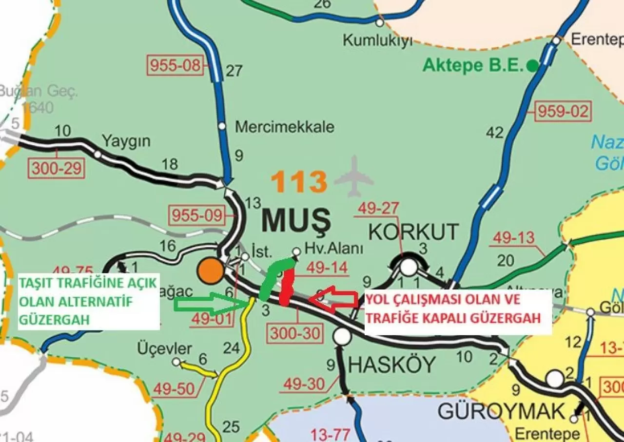 Muş Karayolları 113. Şube Şefliği tarafından yapılan açıklamada, 49-14 KK numaralı Muş-Havalimanı yolunun yol yapım çalışmaları kapsamında taşıt trafiğine kapatıldığı bildirildi. Açıklamada, söz konusu yolun 14 Temmuz 2025 tarihinde saat 22.00 itibarıyla ulaşıma kapandığı belirtildi. Çalışmaların yürütüldüğü 0+000 ile 5+600 kilometreleri arasındaki kesimde ulaşımın sağlanamayacağı, bu nedenle sürücülerin alternatif güzergah olarak Sungu beldesinden geçen yolu kullanmaları gerektiği kaydedildi.
