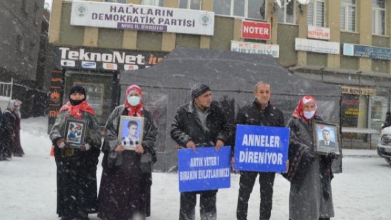 Yoğun kar ve dondurucu soğuğa rağmen eyleme devam eden aileler, üzerinde "Anneler direniyor", "Artık yeter, bırakın evlatlarımızı" ve "Yakamızdan düşün" yazılı pankartlar açtı, HDP ve PKK’ya tepki gösterdi.
