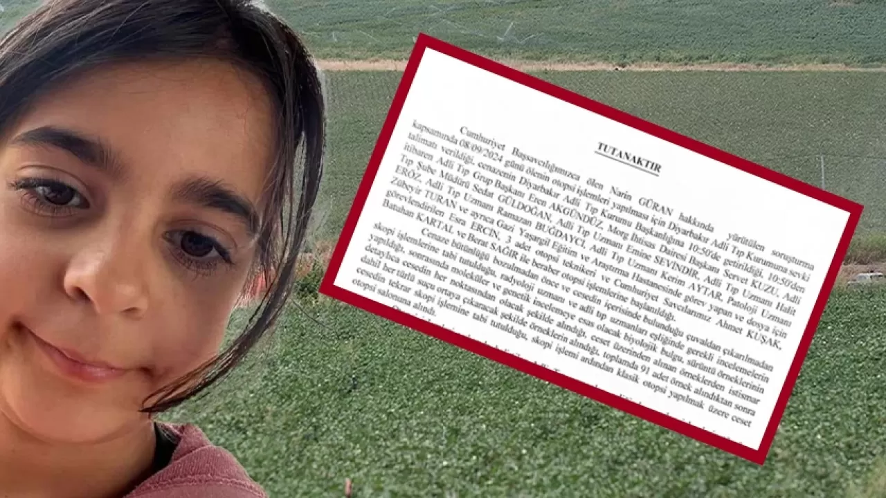 "Cumhuriyet Başsavcılığımızca ölen Narin GÜRAN hakkında yürütülen soruşturma kapsamında 08/09/2024 günü ölenin otopsi işlemleri yapılması için Diyarbakır Adli Tıp Kurumuna sevki talimatı verildiği, cenazenin Diyarbakır Adli Tıp Kurumu Başkanlığına 10.50'de getirildiği, 10.50'den itibaren Adli Tıp Grup Başkanı Eren AKGÜNDÜZ, Morg Ihtisas Dairesi Başkanı Servet KUZU, Adli Tip Şube Müdürü Sedat GÜLDOGAN, Adli Tip Uzmanı Emine SEVINDIR, Adli Tip Uzmanı Halit ERÖZ, Adli Tip Uzmanı Ramazan BUĞDAYCI, Adli Tip Uzmanı Kerim AYTAR, Patoloji Uzmanı Zübeyir TURAN ve ayrıca Gazi Yaşargil Eğitim ve Araştırma Hastanesinde görev yapan ve dosya için görevlendirilen Esra ERCIN, 3 adet otopsi teknikeri ve Cumhuriyet Savcılarımız Ahmet KUŞAK. Batuhan KARTAL ve Berat SAGIR ile beraber otopsi işlemlerine başlanıldığı.