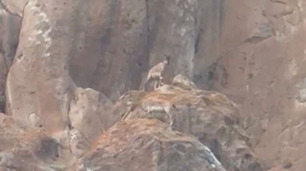 Yaban keçileri, kayalıklarda gezerken fark eden vatandaşlar, o anlar cep telefonuyla kaydetti. Bir anda vatandaşları fark eden keçiler daha sonra kayalıklara tırmanarak uzaklaştı.
