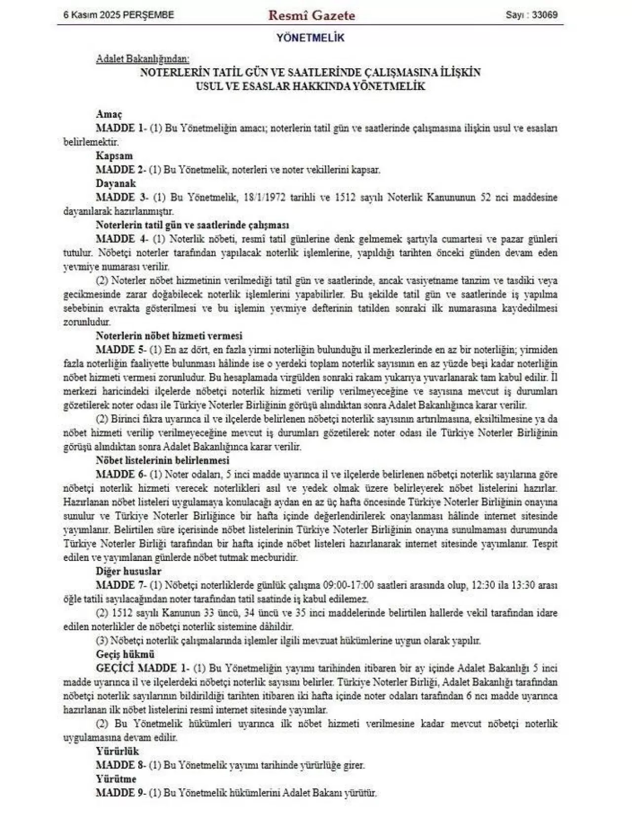 Adalet Bakanlığı, 'Noterlerin tatil gün ve saatlerinde çalışmasına ilişkin usul ve esaslar hakkında yönetmelik'te değişikliğe gitti. Karar Resmi Gazete'de yayımlandı.