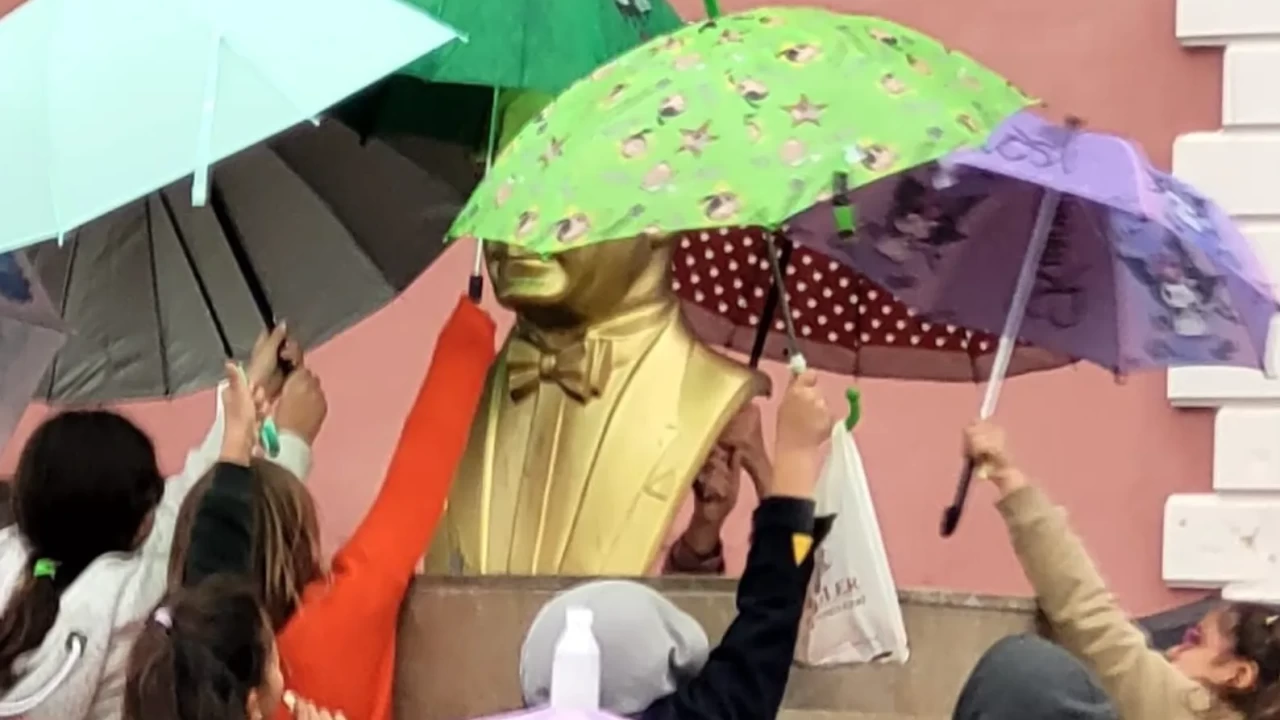 ADANA’nın Ceyhan ilçesinde teneffüse çıkan ilkokul öğrencileri, yağmur başlayınca ıslanmaması için Atatürk büstünü şemsiyeleriyle korudu.