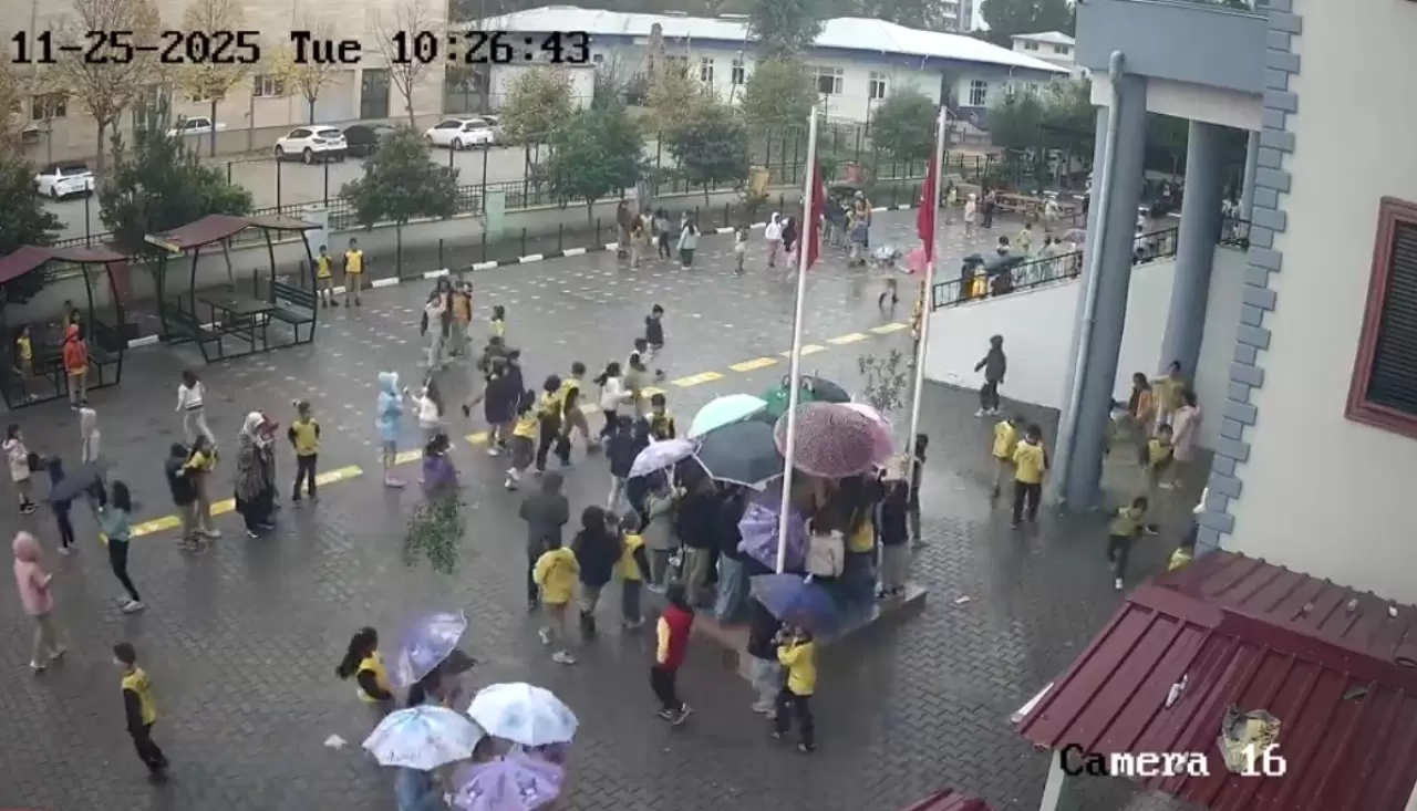 Yaklaşık 10 öğrenci, el ele vererek şemsiyeleriyle büstün üzerini çatı gibi kapattı. Ders zili çalsa da bazı çocukların büstü bırakmayıp şemsiye ile Atatürk büstünü koruduğu görüldü. Nöbetçi öğretmenlerin dikkatini çeken anlar, cep telefonu kamerasıyla görüntülendi.
