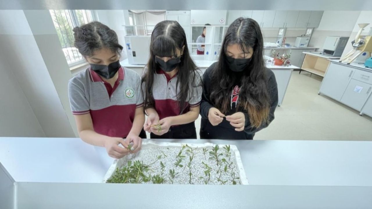 Okulun modern laboratuvarlarında toprak analizi ve diğer işlemleri yapan öğrenciler, büyük bir özenle hazırladıkları tohumları daha sonra seralarda büyütüyor.
