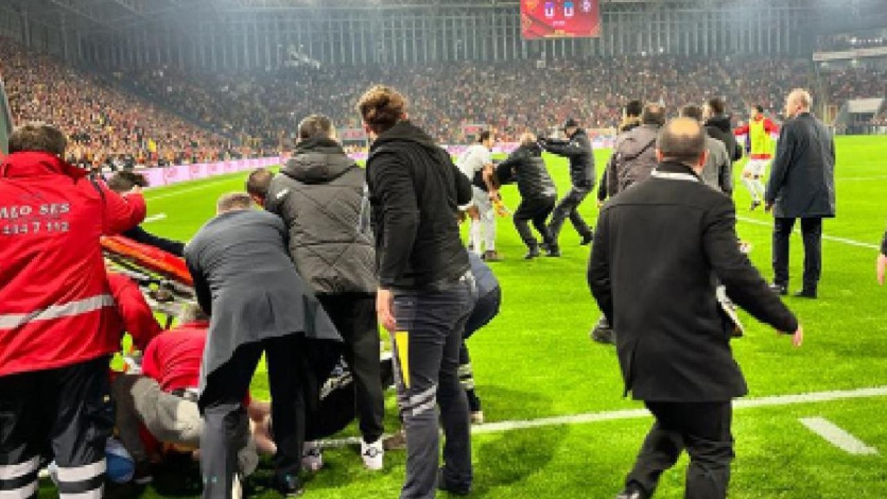 Bu sırada yaralanan taraftar olduğu bilgisi üzerine 2 ambulans sahaya girdi. Müsabaka 22. dakikada durdu.