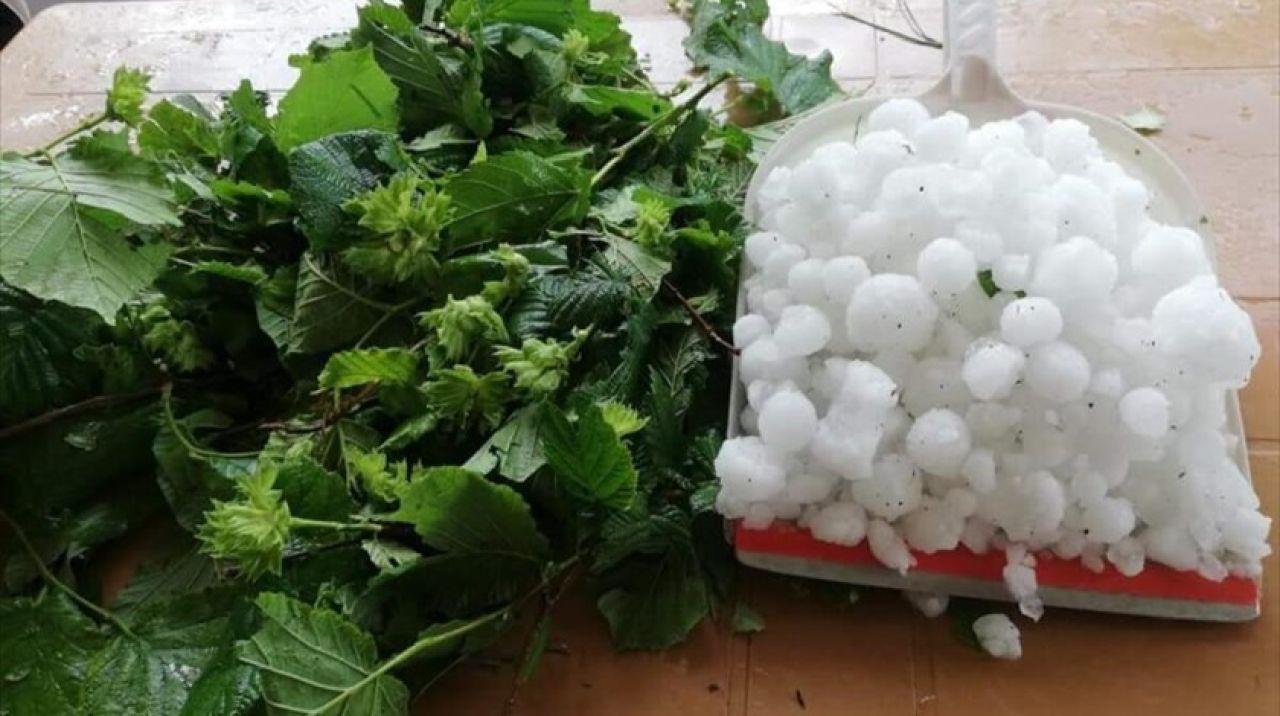 Ceviz büyüklüğündeki dolu yağışının fındık bahçelerine de zarar verdiği belirtildi.