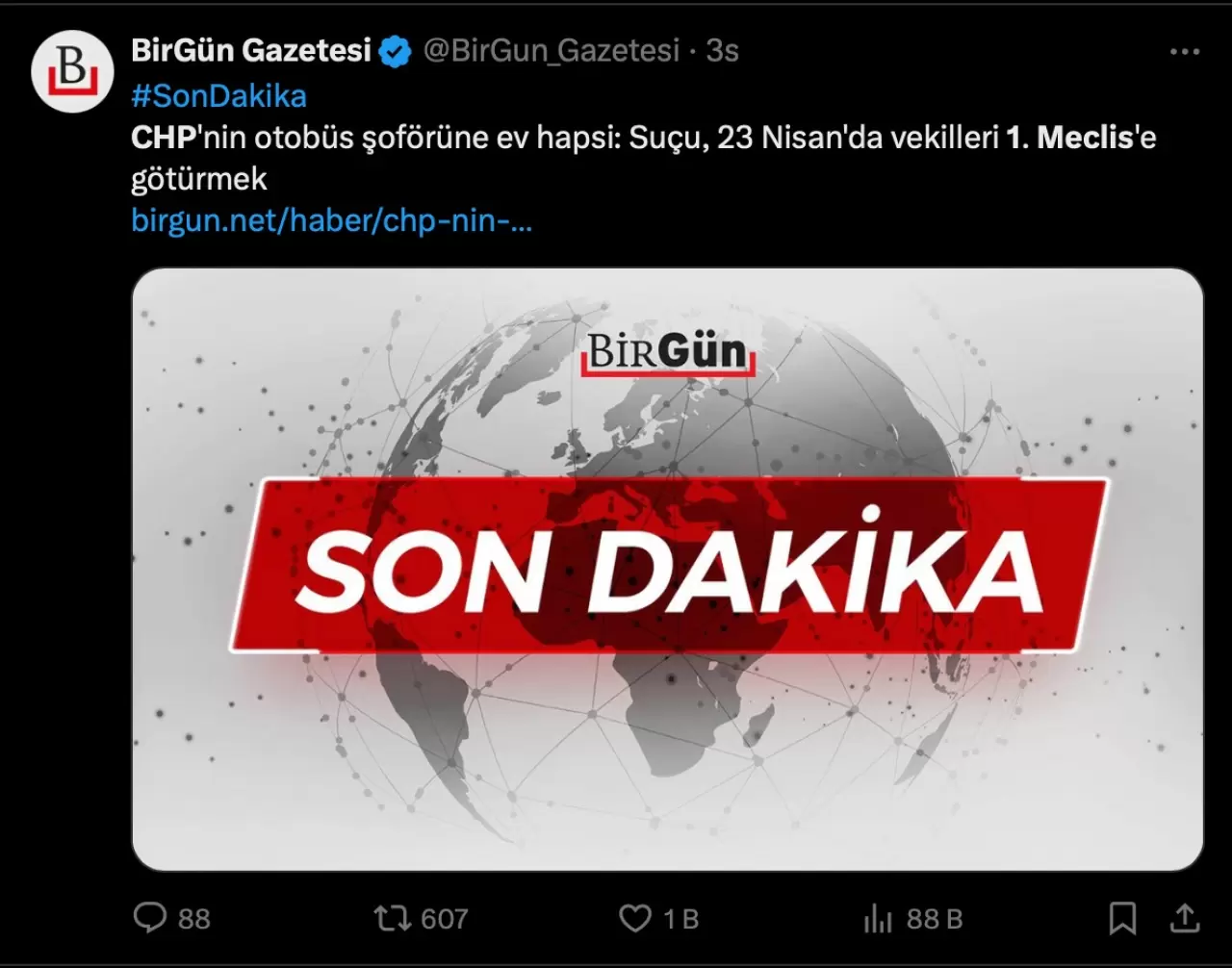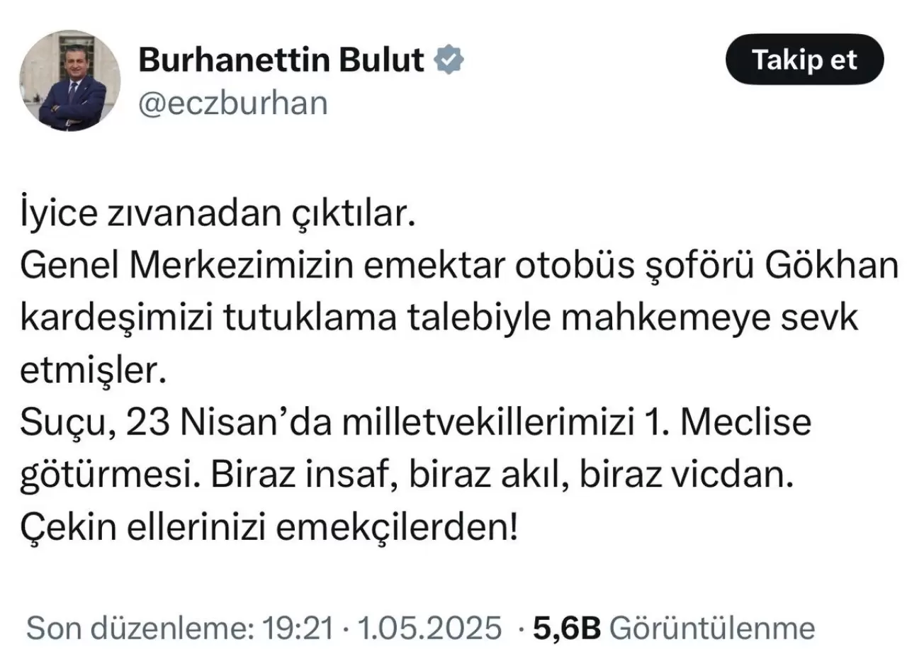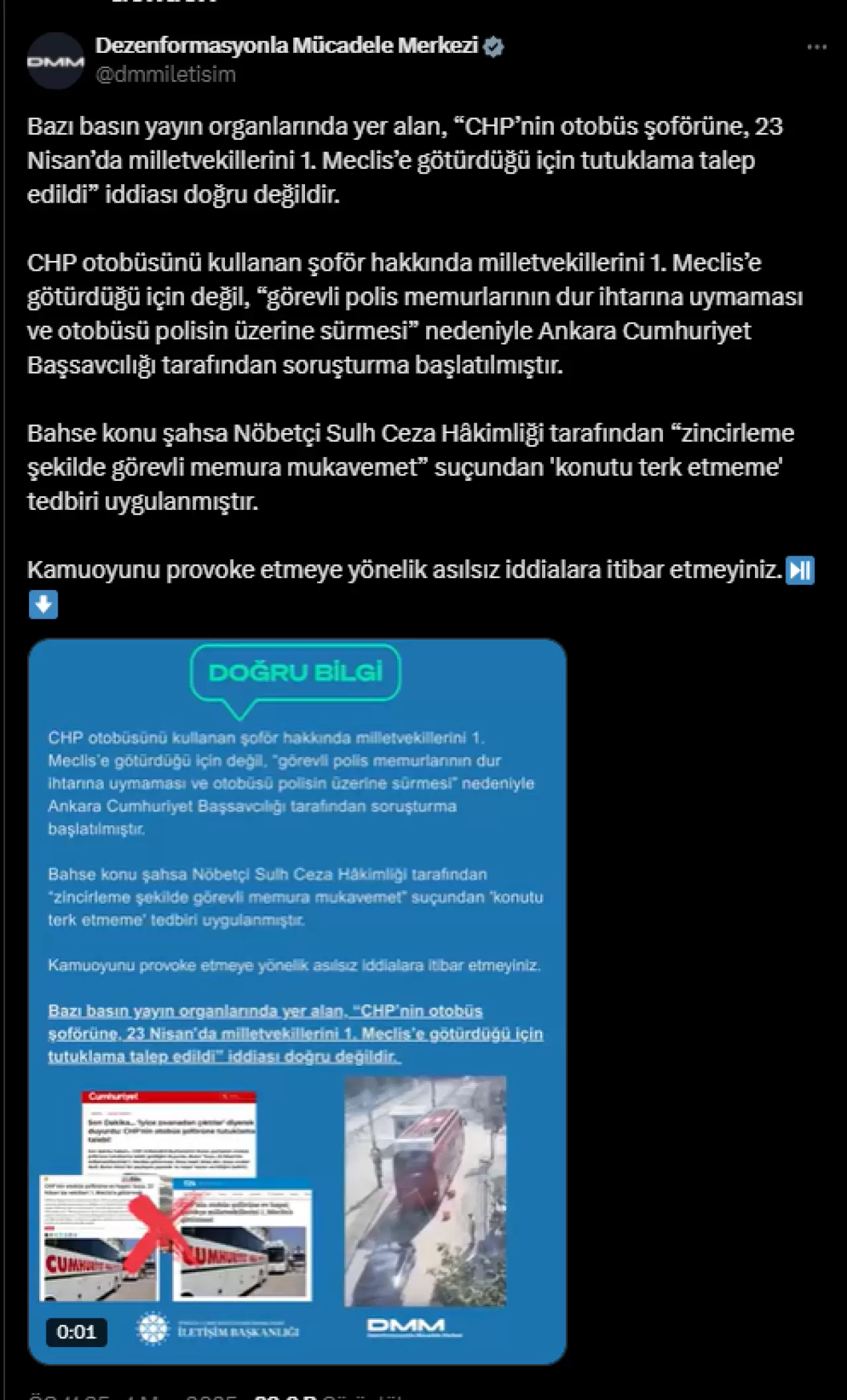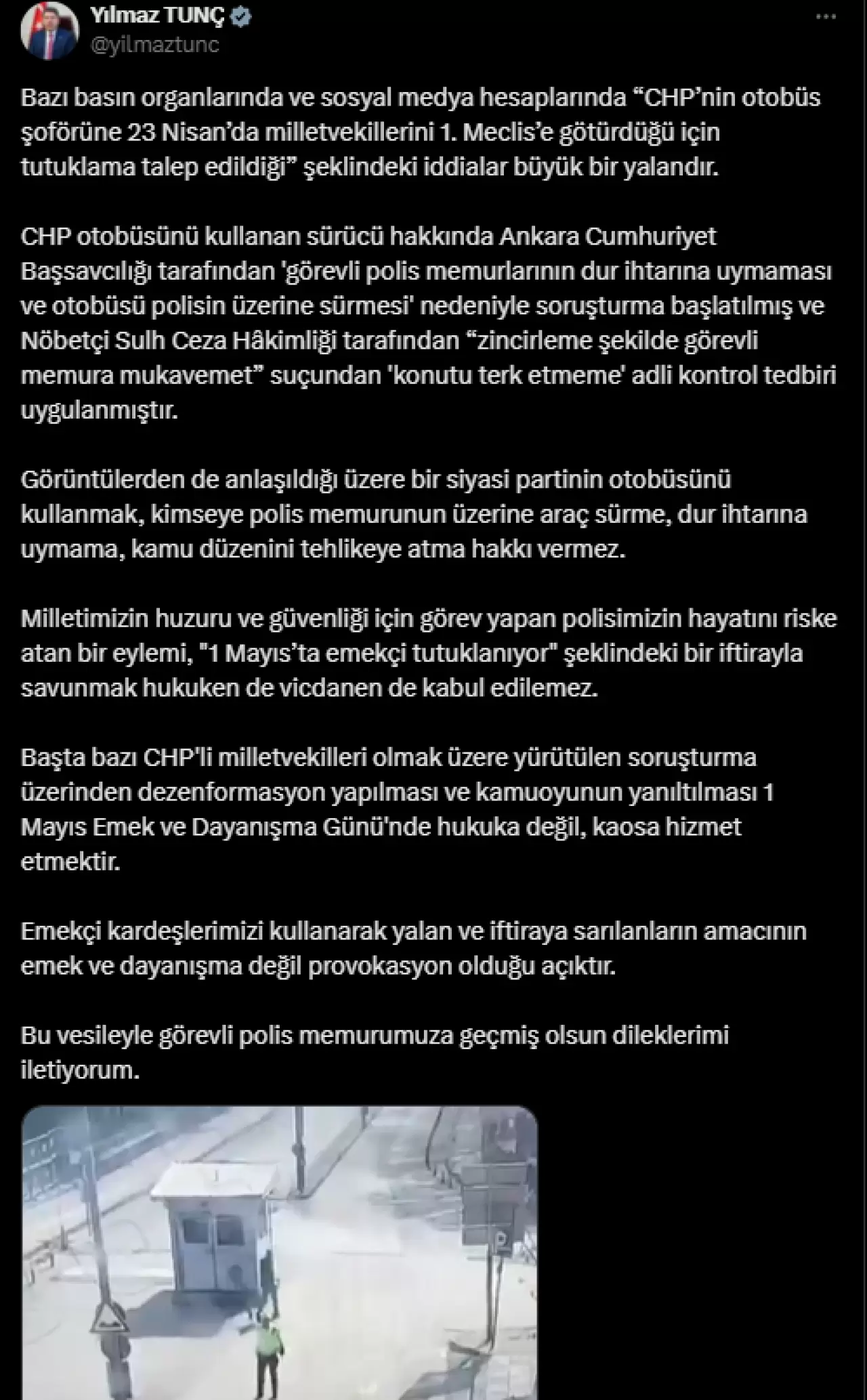 "Bazı basın organlarında ve sosyal medya hesaplarında “CHP’nin otobüs şoförüne 23 Nisan’da milletvekillerini 1. Meclis’e götürdüğü için tutuklama talep edildiği” şeklindeki iddialar büyük bir yalandır. CHP otobüsünü kullanan sürücü hakkında Ankara Cumhuriyet Başsavcılığı tarafından 'görevli polis memurlarının dur ihtarına uymaması ve otobüsü polisin üzerine sürmesi' nedeniyle soruşturma başlatılmış ve Nöbetçi Sulh Ceza Hâkimliği tarafından “zincirleme şekilde görevli memura mukavemet” suçundan 'konutu terk etmeme' adli kontrol tedbiri uygulanmıştır. Görüntülerden de anlaşıldığı üzere bir siyasi partinin otobüsünü kullanmak, kimseye polis memurunun üzerine araç sürme, dur ihtarına uymama, kamu düzenini tehlikeye atma hakkı vermez. Milletimizin huzuru ve güvenliği için görev yapan polisimizin hayatını riske atan bir eylemi, "1 Mayıs’ta emekçi tutuklanıyor" şeklindeki bir iftirayla savunmak hukuken de vicdanen de kabul edilemez. Başta bazı CHP'li milletvekilleri olmak üzere yürütülen soruşturma üzerinden dezenformasyon yapılması ve kamuoyunun yanıltılması 1 Mayıs Emek ve Dayanışma Günü'nde hukuka değil, kaosa hizmet etmektir. Emekçi kardeşlerimizi kullanarak yalan ve iftiraya sarılanların amacının emek ve dayanışma değil provokasyon olduğu açıktır. Bu vesileyle görevli polis memurumuza geçmiş olsun dileklerimi iletiyorum."