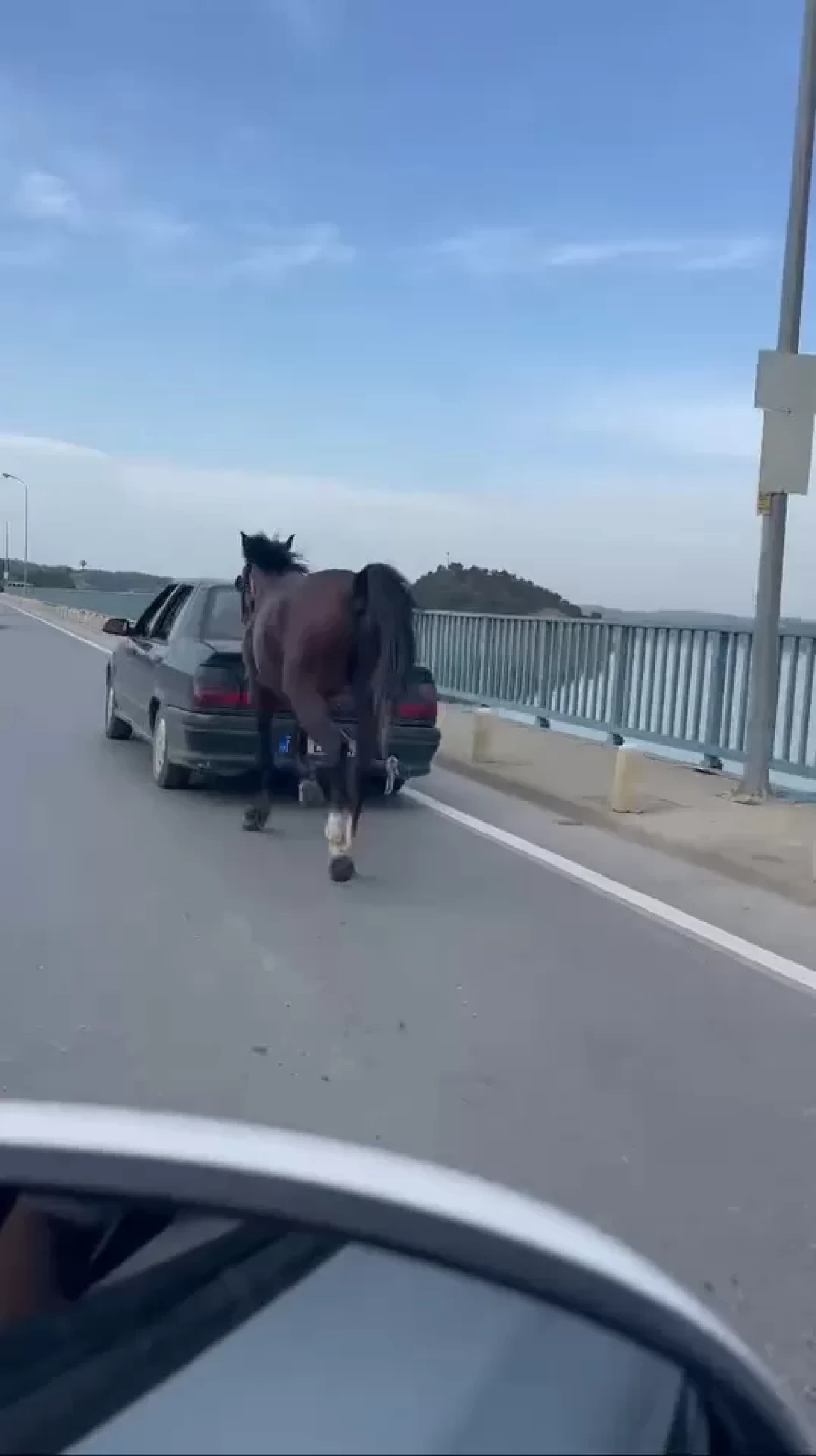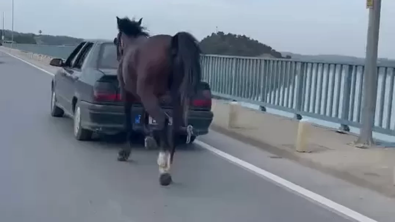 Adana'da arkasına bağladığı at ile seyir halinde olan otomobilin sürücüsü S.T. ile yanındaki A.Ç., gözaltına alındı.