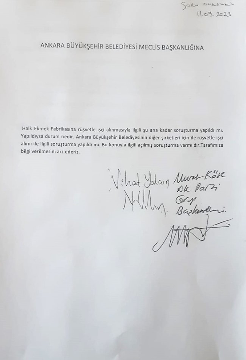 ABB Denetim Komisyonu Başkanı Nihat Yalçın ve ABB AK Parti Grup Başkanvekili Murat Köse tarafından ABB Meclisi'ne verilen soru önergesinde, "Halk Ekmek Fabrikası'nda rüşvet alımı ile ilgili şu ana kadar bir soruşturma yapıldı mı? Yapıldıysa durum nedir? Ankara Büyükşehir Belediyesi'nin diğer şirketleri için de rüşvet ile işçi alımı ile ilgili soruşturma yapıldı mı? Bu konu ile ilgili açılmış soruşturma var mı? Tarafımıza bilgi verilmesini arz ederiz" ifadeleri kullanıldı.