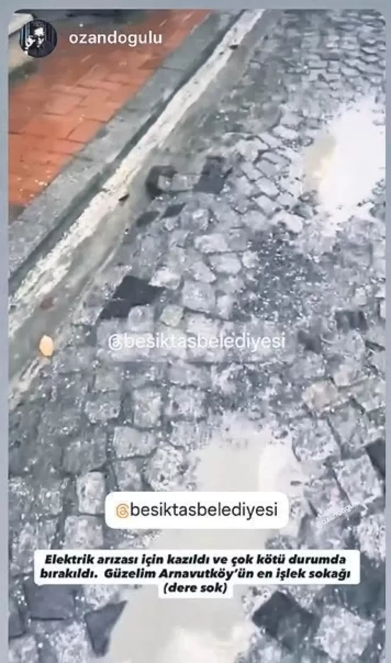 “Elektrik arızası için kazıldı ve çok kötü durumda bırakıldı. Güzelim Arnavutköy'ün en işlek sokağı (Dere Sok.) bu halde! Yazık...”