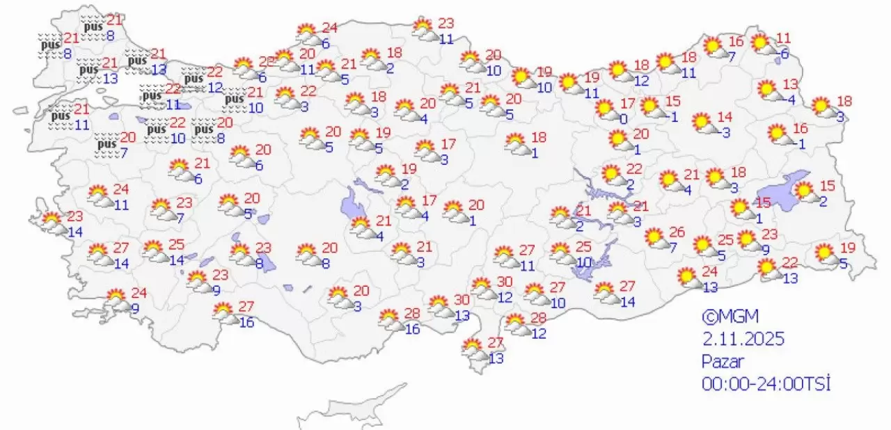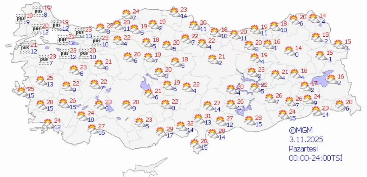 MGM verilerine göre, hafta sonu ülke genelinde güneşli ve ılık hava etkisini sürdürürecek ancak yeni haftada pastırma sıcakları bitecek.