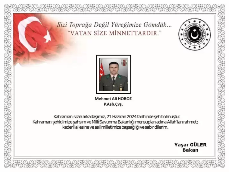 Milli Savunma Bakanlığı (MSB), sosyal medya hesabından bugün arama tarama faaliyeti sırasında bölücü terör örgütü mensupları ile sağlanan temasta Piyade Astsubay Çavuş Mehmet Ali Horoz'un şehit olduğunu duyurdu.