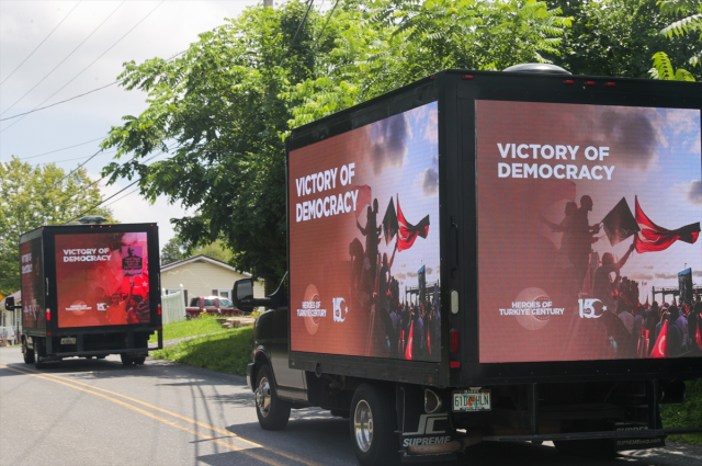Diğer taraftan ışıklı tabelalarda, Türk bayrağı ve darbe girişimi gecesinden fotoğraflarla birlikte, "Demokrasinin Zaferi" yazan iki araç, FETÖ elebaşının bulunduğu Saylorsburg sokaklarında sabahtan yerel saatle 16.00'ya kadar tur attı.