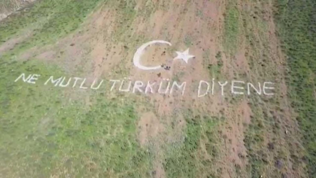 Dağa tırmanan emniyet ve jandarma personeli, çevreden topladıkları taşlarla önce "Ay yıldız" figürü yaptı, ardından Mustafa Kemal Atatürk'ün "Ne mutlu Türk'üm diyene" sözünü yadı.