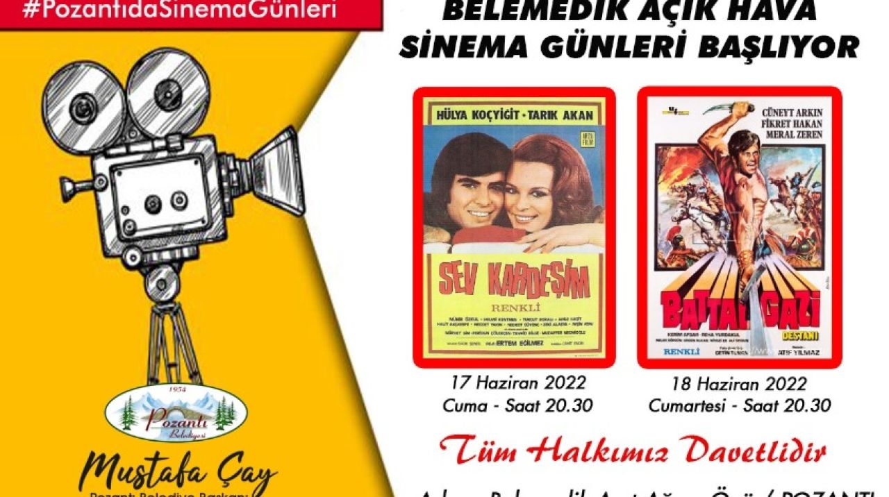 Üretken belediyeciliğin yanında, sosyal ve kültürel hizmetleriyle de göz dolduran Pozantı Belediyesi, 'Açık Hava Sinema Günleri'ni Belemedik Anıt Ağacı altında gerçekleştiriyor. İlk sinema gösterimi 17 Haziran Cuma günü saat 20.30’da “Sev Kardeşim” adlı sinema filmi ile başlayacak. 18 Haziran Cumartesi günü ise yine aynı saatte “Battal Gazi” adlı sinema filmi gösterilecek.