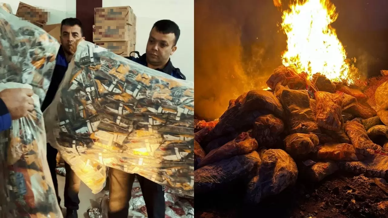 Denetimler sırasında el konulan tarihi geçmiş ürünler, ekipler tarafından kamyonlara yüklenerek imha alanına götürüldü. Açılan toprak çukurlarda ateşe verilen ürünler tamamen imha edildi.