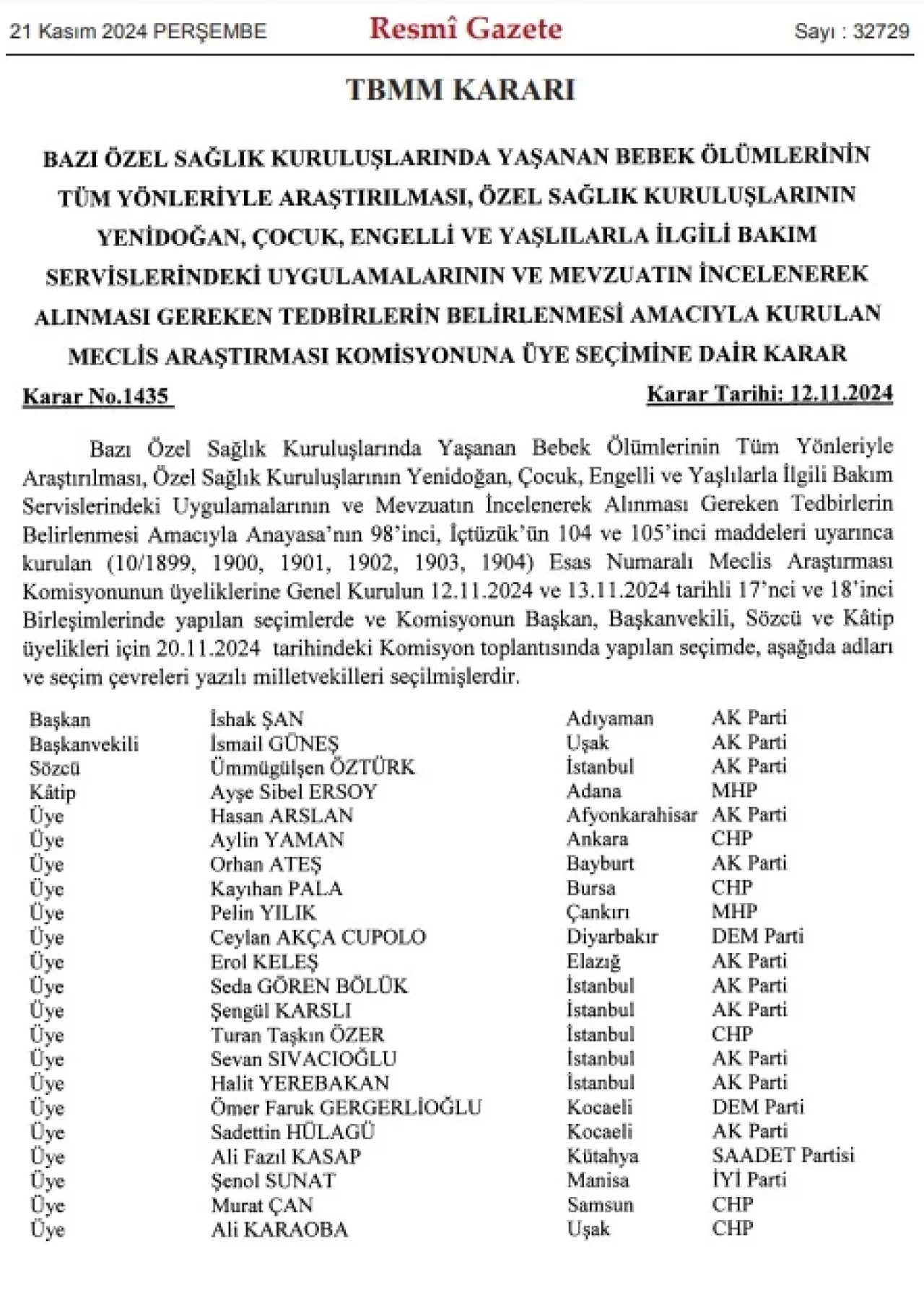 Resmi Gazete’de yayımlanan Türkiye Büyük Millet Meclisi (TBMM) Kararına göre, Bazı Özel Sağlık Kuruluşlarında Yaşanan Bebek Ölümlerinin Tüm Yönleriyle Araştırılması, Özel Sağlık Kuruluşlarının Yenidoğan, Çocuk, Engelli ve Yaşlılarla İlgili Bakım Servislerindeki Uygulamalarının ve Mevzuatın İncelenerek Alınması Gereken Tedbirlerin Belirlenmesi Amacıyla Anayasa'nın 98'inci, İçtüzük'ün 104 ve 105'inci maddeleri uyarınca kurulan Meclis Araştırması Komisyonunun üyeliklerine Genel Kurul’un 12 Kasım 2024 ve 13 Kasım 2024 tarihli 17'nci ve 18'inci Birleşimlerinde yapılan seçimlerde ve komisyonun başkan, başkanvekili, sözcü ve katip üyelikleri için 20 Kasım 2024 tarihindeki komisyon toplantısında yapılan seçimde, aşağıda adları ve seçim çevreleri yazılı milletvekilleri seçildi.