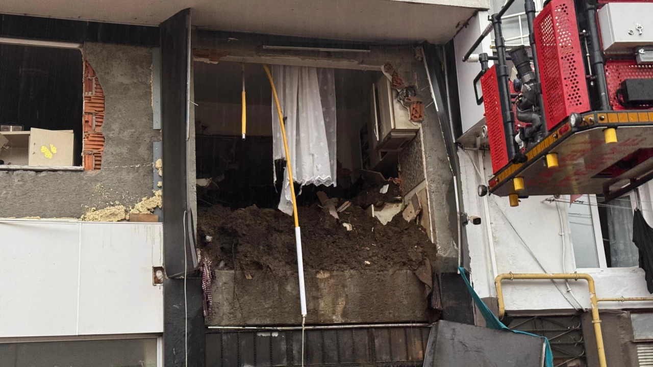 Heyelan nedeniyle yamaçtan kopan toprak kütleri bir siteye ait 6 katlı apartmanın giriş katlarındaki evlere doldu.