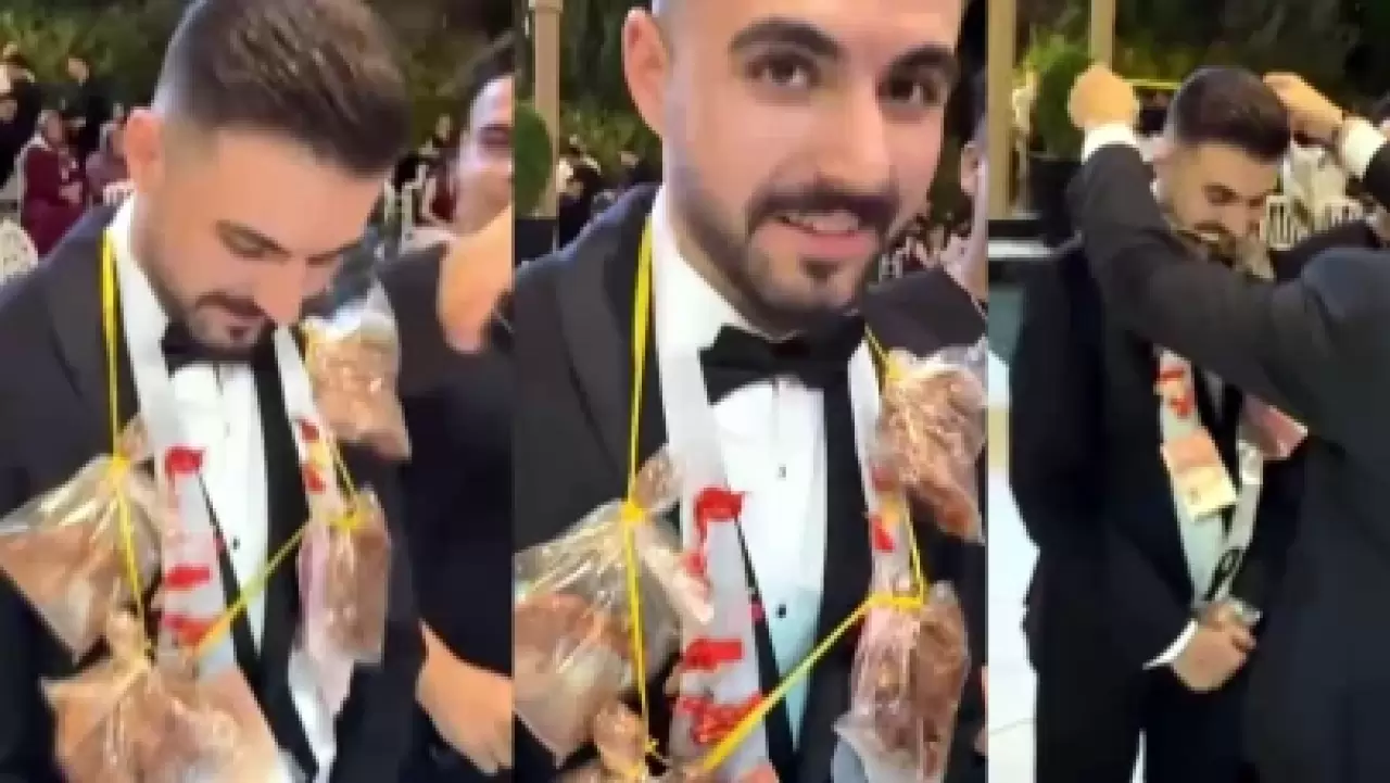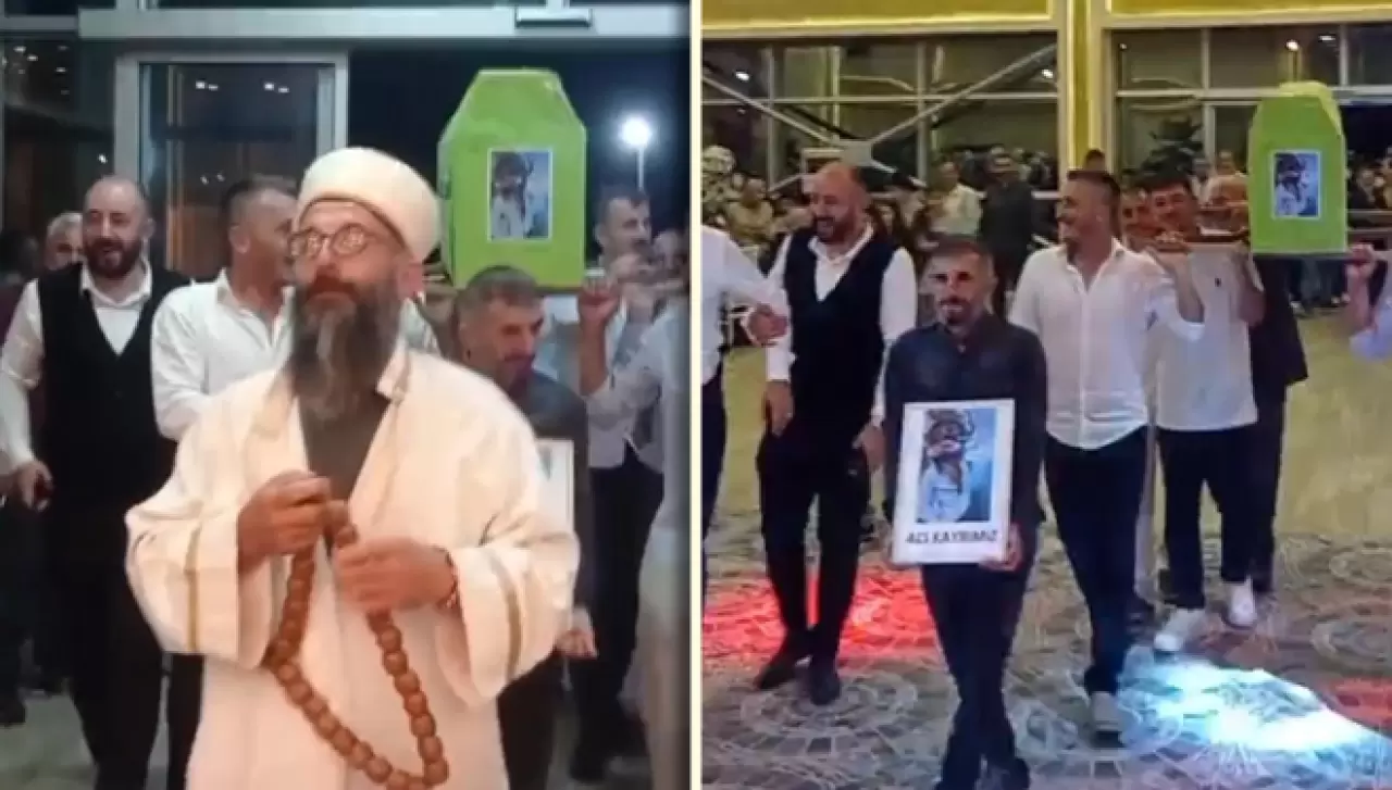 Takı töreni sırasında damadın arkadaşları, kendi elleriyle hazırladıkları tabut maketiyle salona girdi. Tabutun önünde “Acı Kaybımız” yazısı ve damadın fotoğrafını taşıyan arkadaşlardan biri ise imam kılığına girerek hüzünlü bir fon müziği eşliğinde salona adım attı.