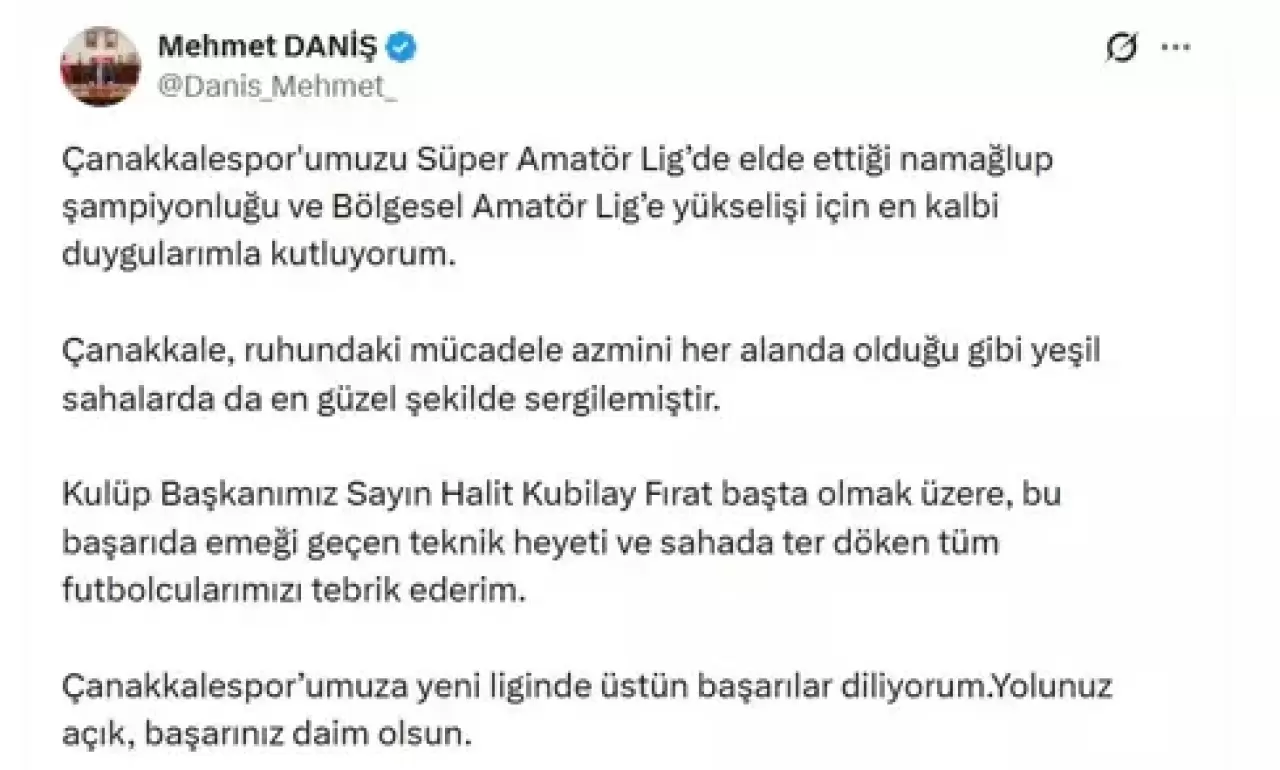 RTÜK Başkanı Daniş, sosyal medya hesabından yaptığı açıklamada, "Çanakkalespor'umuzu Süper Amatör Lig’de elde ettiği namağlup şampiyonluğu ve Bölgesel Amatör Lig'e yükselişi için en kalbi duygularımla kutluyorum. Çanakkale, ruhundaki mücadele azmini her alanda olduğu gibi yeşil sahalarda da en güzel şekilde sergilemiştir. Kulüp Başkanımız Sayın Halit Kubilay Fırat başta olmak üzere, bu başarıda emeği geçen teknik heyeti ve sahada ter döken tüm futbolcularımızı tebrik ederim. Çanakkalespor'umuza yeni liginde üstün başarılar diliyorum. Yolunuz açık, başarınız daim olsun" dedi.