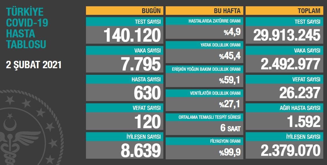 Tabloya göre, ağır hasta sayısı 1592 oldu, 8 bin 639 kişinin Kovid-19 tedavisinin/karantinasının sona ermesiyle iyileşen sayısı 2 milyon 379 bin 70'e yükseldi.