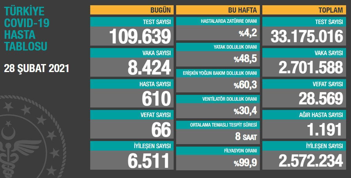 Türkiye'de son 24 saatte 109 bin 639 Kovid-19 testi yapıldı, 8 bin 424 kişinin testi pozitif çıktı, 66 kişi hayatını kaybetti.