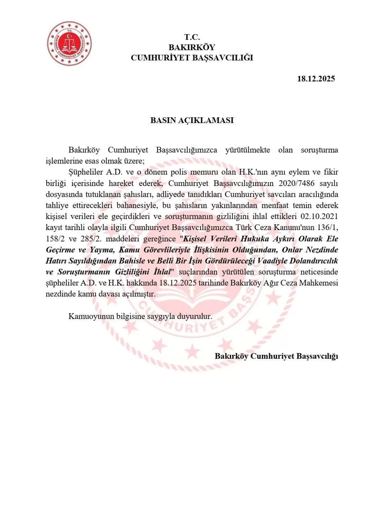 Bakırköy Cumhuriyet Başsavcılığı, konuya ilişkin açıklamanın kamuoyunun bilgisine saygıyla sunulduğunu duyurdu.