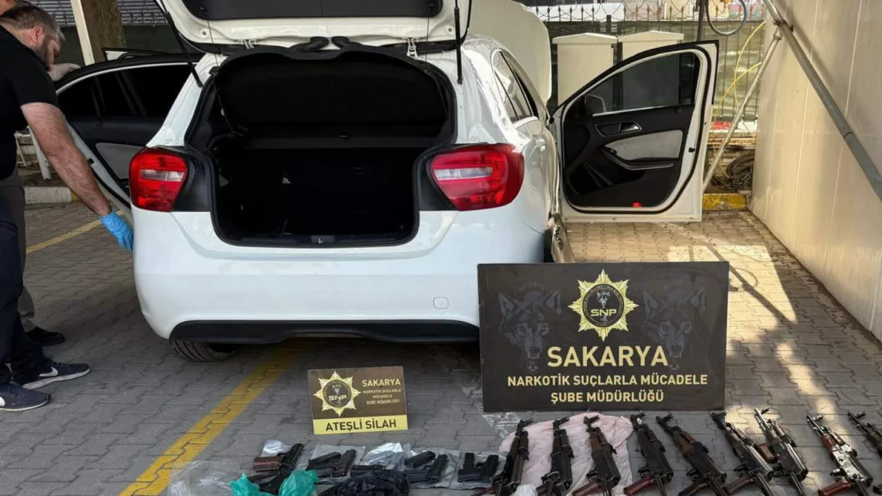Sakarya'da polis memurunun kullandığı kiralık otomobilde yapılan aramada 9 adet AK-47 Kalaşnikof tüfek, 5 adet ruhsatsız tabanca ve bu silahlara ait şarjörler ele geçirildi.