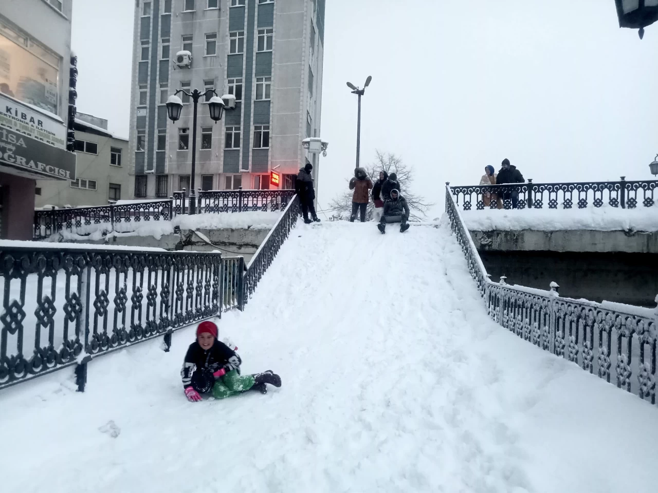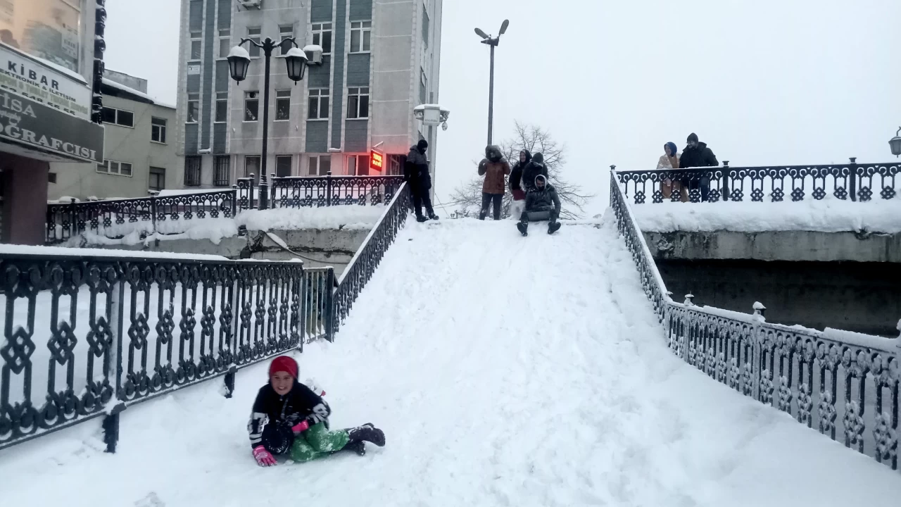 Vatandaşlar, merdivenleri kaymak için uygun hale getirerek kışın tadını çıkardı. Kayak keyfini görenler de bölgeye gelerek hem fotoğraf çektirdi hem de poşetle kayarak eğlenceli vakit geçirdi.