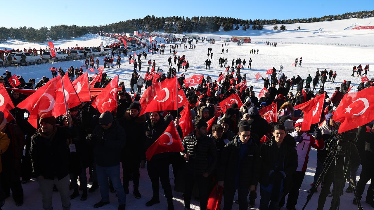 Kars merkez ve Sarıkamış ilçesinden otobüslerle zirveye ulaşan vatandaşlar, ellerinde Türk bayraklarıyla yürüyerek toplanma alanına ulaştı.
