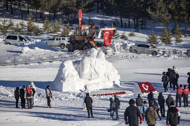 Vatandaşlar, Kızılçubuk bölgesinde şehitler anısına ilk kez yapılan kardan heykellerin önünde fotoğraf çektirdi.