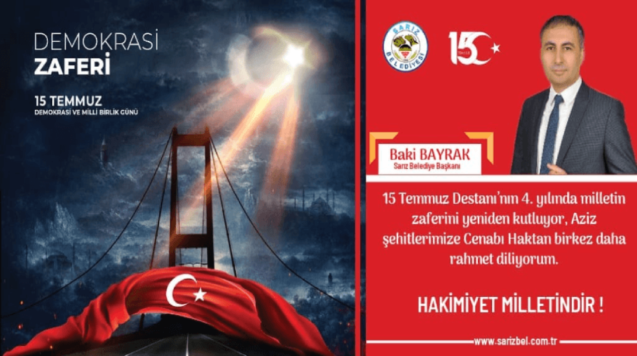 Sarız Belediye Başkanımız Baki Bayrak 15 Temmuz Demokrasi ve Milli Birlik Günü dolayısıyla yayınladığı mesajında şu ifadelere yer verdi: