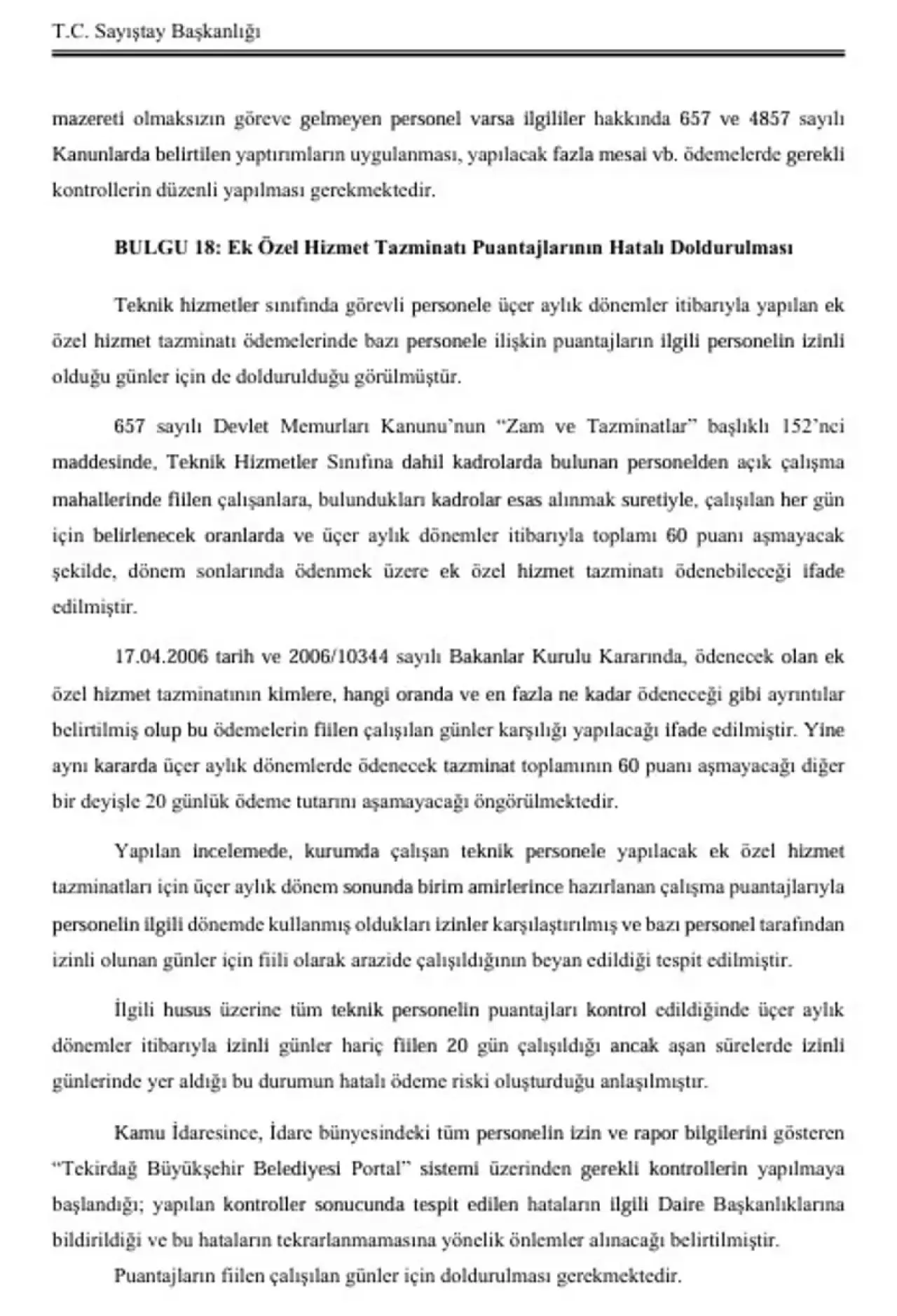 Denetimde ayrıca personel takip sistemine kaydı olmayan bir personele fazla mesai ücreti ödendiği, ek özel hizmet tazminatı puantajlarının hatalı düzenlendiği ve yevmiye defterlerinde boş sayfa bırakıldığı belirtildi. Sayıştay, tespit edilen aykırılıkların ihale, mali işler, personel, imar ve muhasebe alanlarında yoğunlaştığını bildirdi.