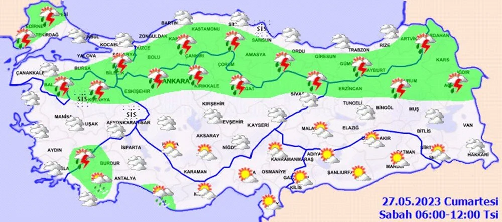 Meteoroloji Genel Müdürlüğü tarafından yapılan son değerlendirmelere göre: Ülkemiz genelinin parçalı ve çok bulutlu, Trakya, Ege, Akdeniz'in iç kesimleri, İç Anadolu, Batı Karadeniz, Orta ve Doğu Karadeniz’in iç kesimleri, Doğu Anadolu(Şırnak ve Hakkari hariç), Güneydoğu Anadolu'nun batısı ile Balıkesir, Yalova, Sakarya, Kocaeli, Bilecik, Alanya, Hatay ve Diyarbakır çevrelerinin yerel olmak üzere aralıklı sağanak ve gök gürültülü sağanak yağışlı geçeceği tahmin ediliyor. Yağışların Kütahya, Afyonkarahisar, Denizli, Burdur ve Isparta'nın doğusu, Eskişehir, Ankara ve Çankırı ile gece saatlerinde Sakarya, Bilecik, Düzce ve Zonguldak çevrelerinde yer yer kuvvetli olması bekleniyor. Sabah saatlerinde İç Ege ile Samsun çevrelerinde yer yer yoğun olmak üzere sis ve pus olayı bekleniyor.